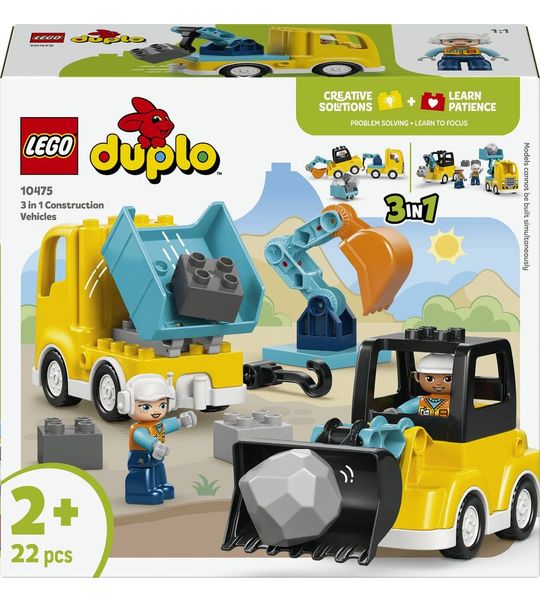 XMet de LEGO DUPLO 10475 3-in-1 Bouwvoertuigen gaan de avonturen van jonge bouwers echt van start. Dit veelzijdige speelgoedset biedt peuters de kans om hun creativiteit en fantasie de vrije loop te laten. De set bevat niet alleen twee schattige figuren, maar ook verschillende stenen waarmee kinderen hun eigen graafmachine, kiepwagen, sleepwagen of laadwagen kunnen bouwen. Het gebruik van kleurrijke en stevige LEGO DUPLO-elementen maakt dit speelgoed niet alleen aantrekkelijk, maar ook veilig voor de kleinste bouwers.