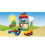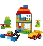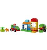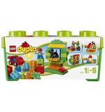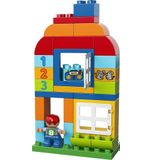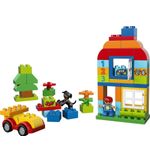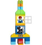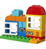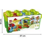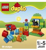 De LEGO DUPLO Alles-in-één Doos bevat 65 stukjes, waaronder blokken in verschillende vormen en kleuren, deuren, ramen, bloemen en LEGO DUPLO-figuren. Dit biedt talloze mogelijkheden voor het bouwen van verschillende structuren en het creëren van verschillende scènes. Kinderen kunnen hun fijne motoriek verbeteren en hun creatieve denkvermogen ontwikkelen terwijl ze de blokken stapelen, bouwen en combineren.