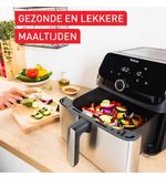 XMet de Tefal EY855D Airfryer Zwart haal je een veelzijdige keukenhulp in huis die je culinaire ervaring zal transformeren. Deze airfryer combineert stijlvol design met geavanceerde technologieën, waardoor je eenvoudig en snel allerlei gerechten kunt bereiden met minder vet. Verwen jezelf en je gezin met heerlijke maaltijden, van knapperige frietjes tot sappige kipfilets en smakelijke groenten, allemaal met een gezondere twist.