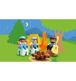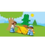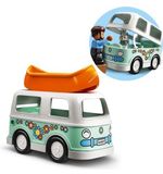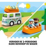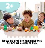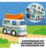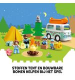 De LEGO DUPLO Familie Camper Avonturen - 10946 bevat een heel scala aan leuke functies en details. Je kunt de camper openmaken en aan de binnenkant vind je een volledig uitgeruste keuken, een gezellige eethoek en een comfortabel bed waar de LEGO DUPLO familie na een dag vol avonturen tot rust kan komen. Daarnaast is er ook nog een buitentafel met stoelen om heerlijk te genieten van het buitenleven. Je kunt de kleurrijke accessoires zoals de fietsen, de barbecue en de picknickmand toevoegen om het kampeersfeertje compleet te maken.