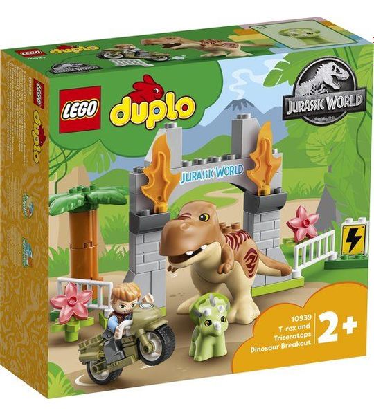 De LEGO DUPLO T-Rex en Triceratops Dinosaurus Ontsnapping - 10939 is een perfect cadeau voor kinderen die gefascineerd zijn door dinosaurussen en avontuur. Het speelgoed zorgt voor urenlang speelplezier en stimuleert de ontwikkeling van vaardigheden. Laat je kinderen de spanning van het dinosaurusleven ervaren met deze spannende set!